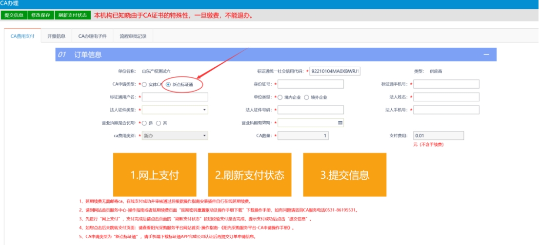 供應商CA申請位置:單位信息-CA辦理。