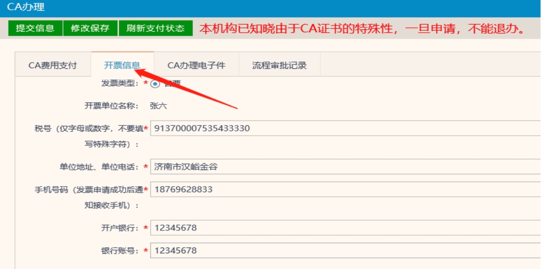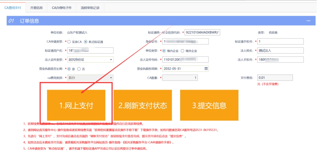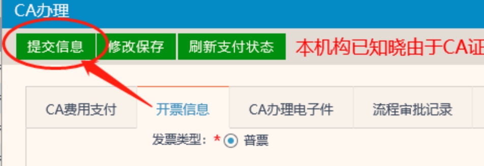 信息保存后點擊CA申請頁面-網(wǎng)上支付按鈕,支付CA費用。