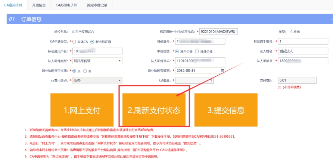 支付完成后點擊CA辦理頁面的“刷新支付狀態(tài)”按鈕,查詢是否支付成功。