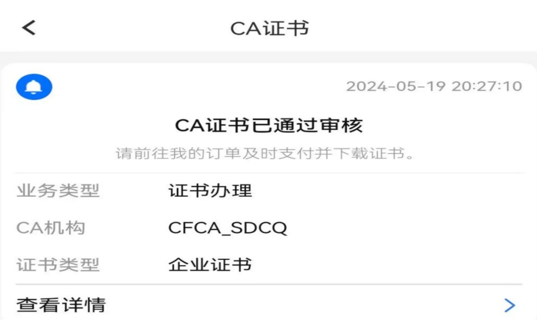 訂單審核通過后,手機APP、手機短信收到證書下載提醒。