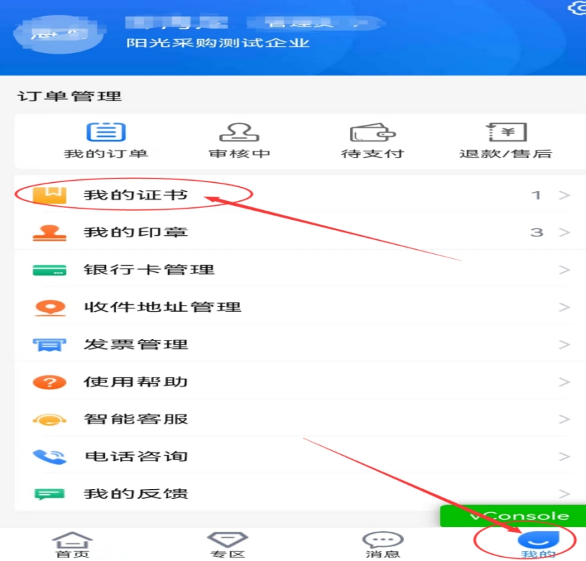 CA訂單審核通過后,進入手機標證通,點擊“我的”,之后點擊“我的證書”下載平臺證書。