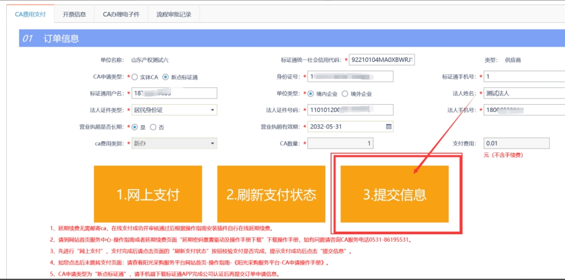 支付完成后點擊頁面的“提交信息”按鈕,提交CA辦理訂單信息,等待中心管理人員審核。