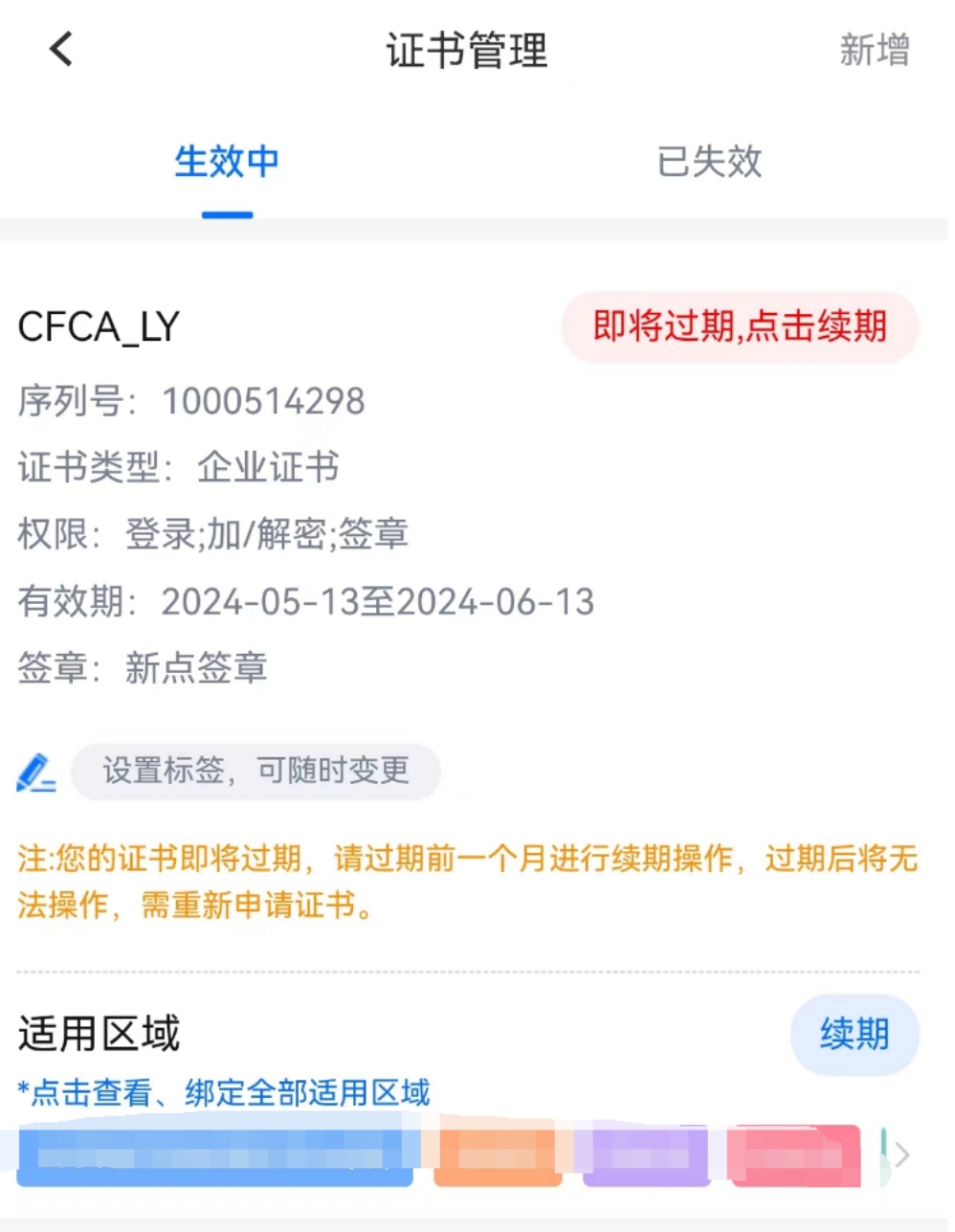 點擊CA辦理菜單-延期續(xù)費,之后點擊頁面新增按鈕:CA辦理類型選擇:“標證通”,按照彈出框的提示選擇對應的需要延期續(xù)費的CA(可以是電子ca續(xù)費,也可以由實體ca續(xù)費至電子ca)