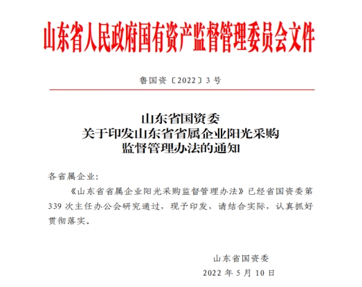 2022年5月16日,山東省國(guó)資委正式發(fā)布《山東省省屬企業(yè)陽(yáng)光采購(gòu)監(jiān)督管理辦法》(以下簡(jiǎn)稱:《管理辦法》),對(duì)進(jìn)一步加強(qiáng)國(guó)有企業(yè)陽(yáng)光采購(gòu)工作作出部署安排。